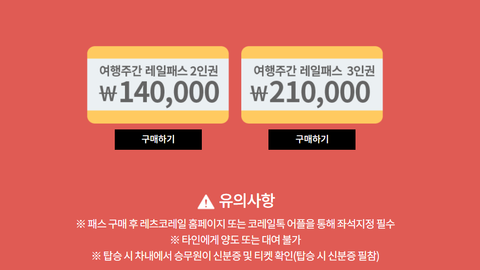 여행주간 레일패스 여행주간 홈페이지(바로이동)를 통해 할인권을 구입하고나서 레츠코레일 홈페이지 및 레일톡 어플을 통해 좌석지정을 해야 합니다. 승차시 승무원이 본인 신분을 확인한다고 하니 참고해주세요!