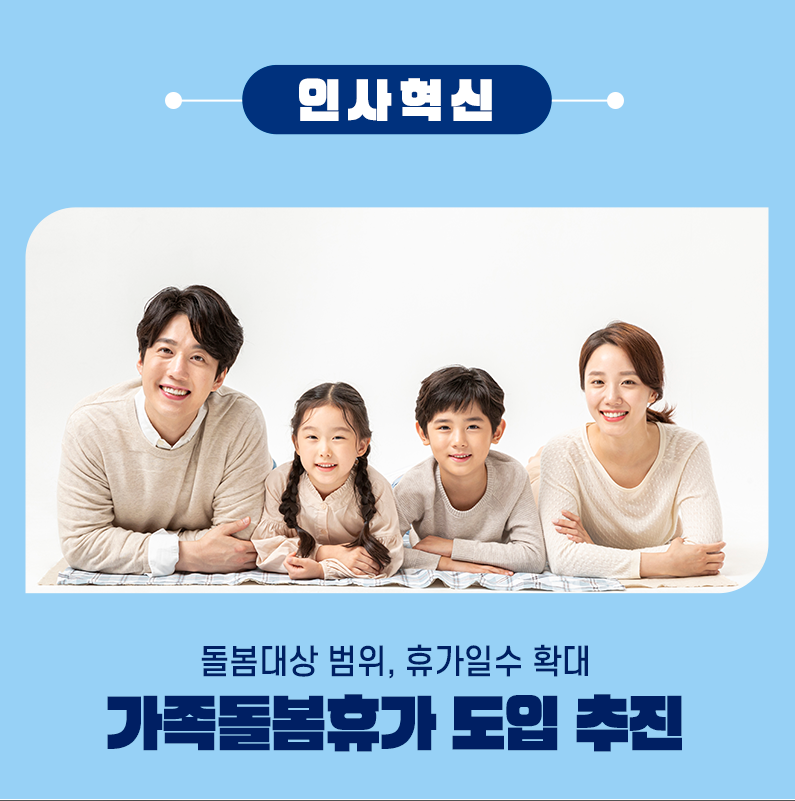 : 기존에는 공식적인 행사, 병원동행 등 밖에 안되었지만 노모 봉양, 양육의 필요성, 가정에서 돌봄 휴식 등 다양한 사유로 가족돌봄휴가를 공무원도 실시할 수 있습니다.