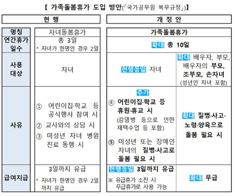 공무원 가족돌봄휴가 (자녀->가족, 3일->10일)