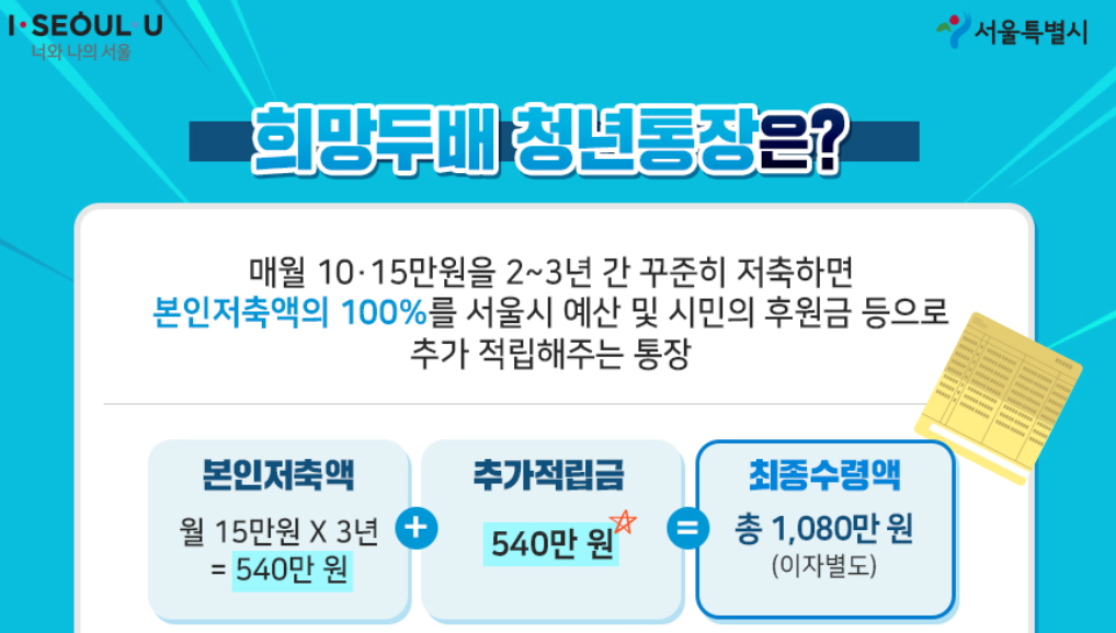 본인 저축액만큼 서울시에서 매월 똑같이 지원해주며 10~15만원 중 선택할 수 있고 기간도 2~3년 설정할 수 있습니다.