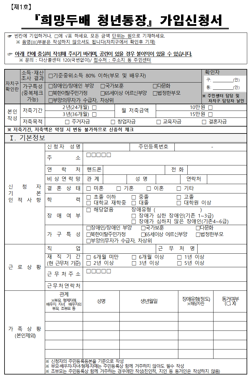 희망두배 청년통장 가입신청서 희망두배 청년통장가입신청서에는 신청자의 개인정보 및 근로상황 가족상황을 자세히 적도록 되어 있습니다.