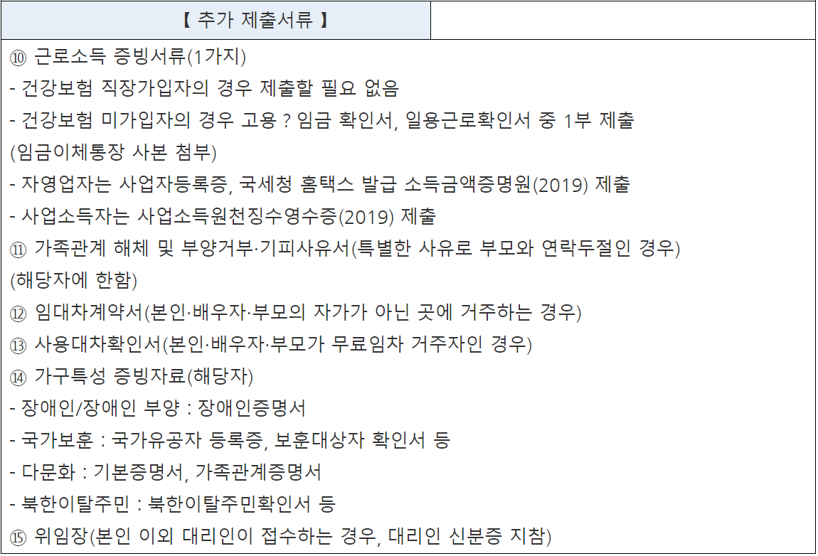 추가제출서류 추가적으로 자격조건이나 장애, 다문화등 특별한 사유를 증빙하기 위한 서류가 있으니 자세히 살펴봐야겠습니다.