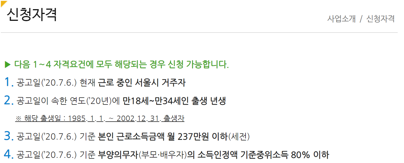 희망두배 청년통장 신청자격 첫째, 공고일(2020.7.6.) 기준으로 현재 서울시 거주 근로자여야 합니다.