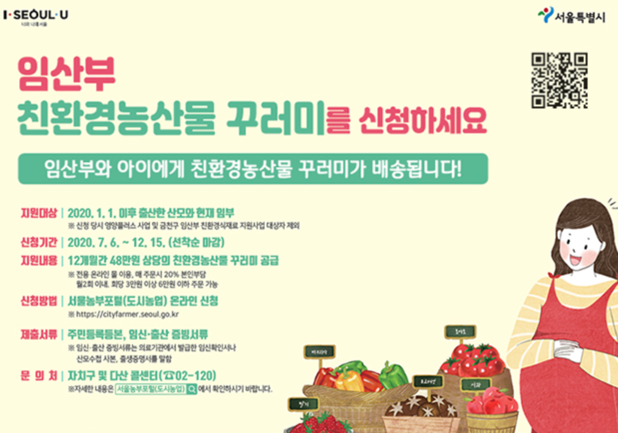 다양한 영양소 섭취가 필수인 임산부들을 위해 서울시에서 친환경 농산물 꾸러미를 가정으로 배송해주는 사업을 실시합니다.