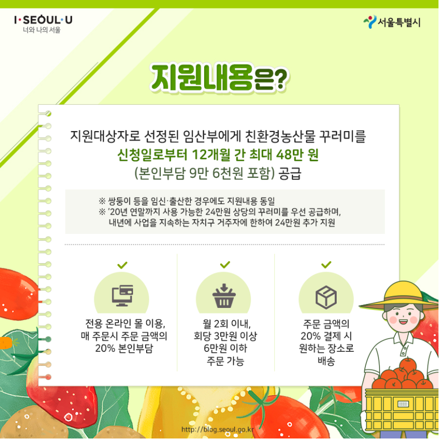 서울시 임산부 친환경농산물 꾸러미 대상자로 선정되면 임산부에게 신청일로부터 12개월 간 최대 48만 원 상당의 꾸러미가 제공됩니다.