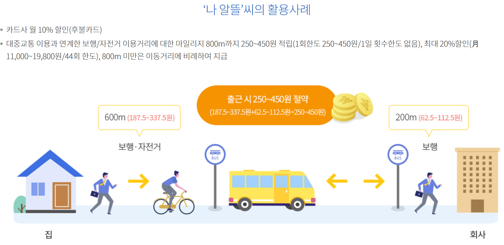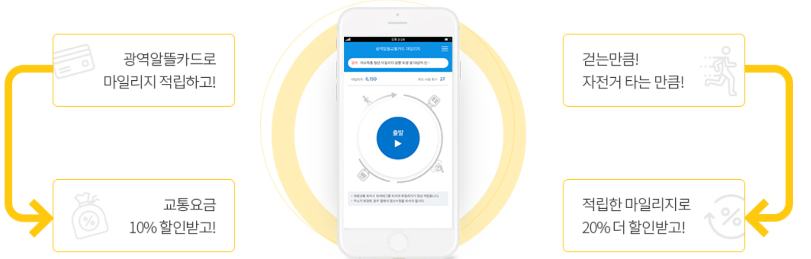 대중교통을 이용하기 위해서 걷거나 자전거로 이동한 거리만큼 마일리지를 적립할 수 있고, 아울러 카드사 추가 할인 혜택까지 포함하여 대중교통 이용요금의 30%까지 할인받을 수 있는 교통카드를 말합니다!