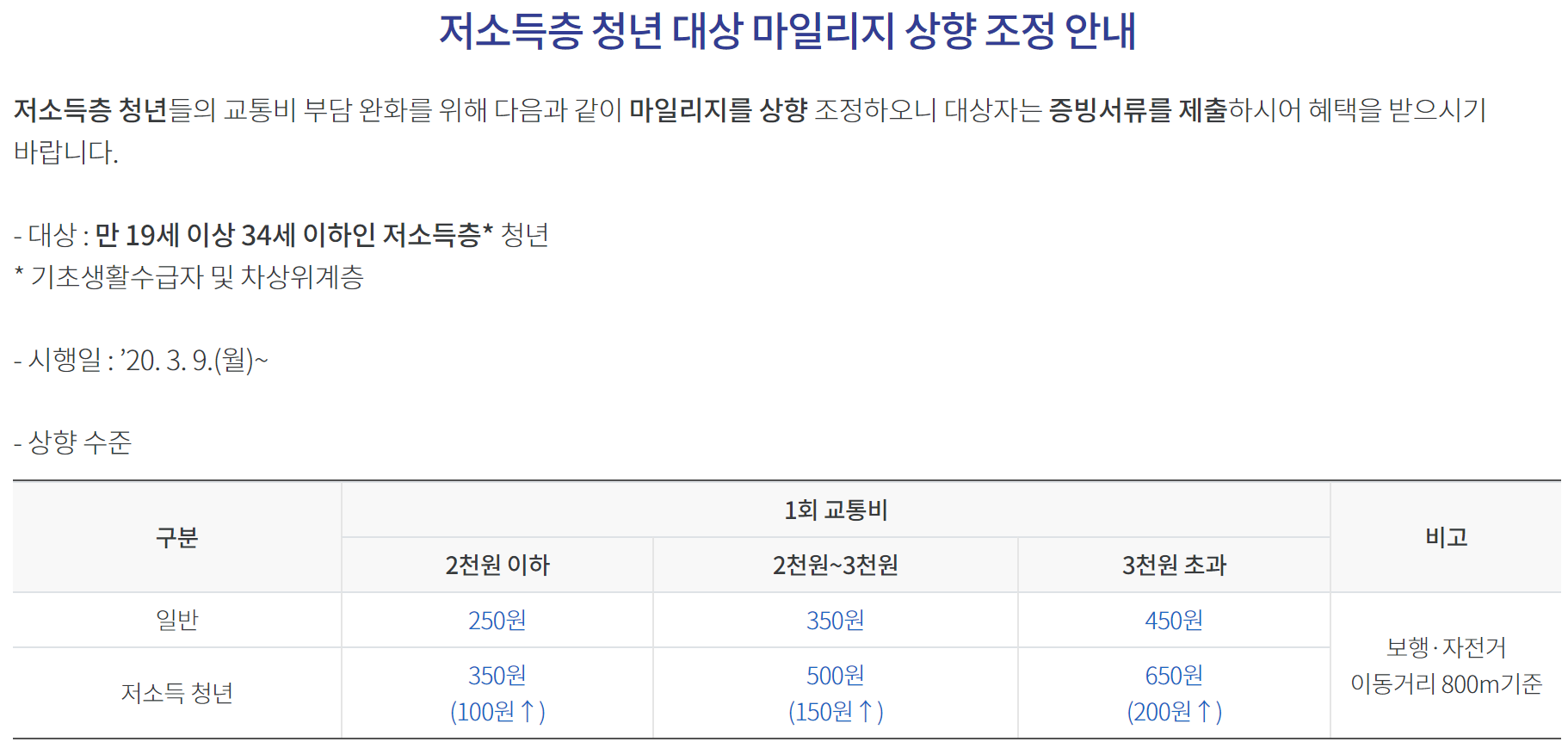 저소득층 청년 대상에게는 마일리지 적립이 상향 조정됩니다. 만 19세 이상 ~ 34세 이하 저소득층 청년이라면 증빙서류만 간단하게 제출하면 1회 적립금이 최대 650원까지 늘어난다고 하니 꼭 살펴보아야겠습니다.