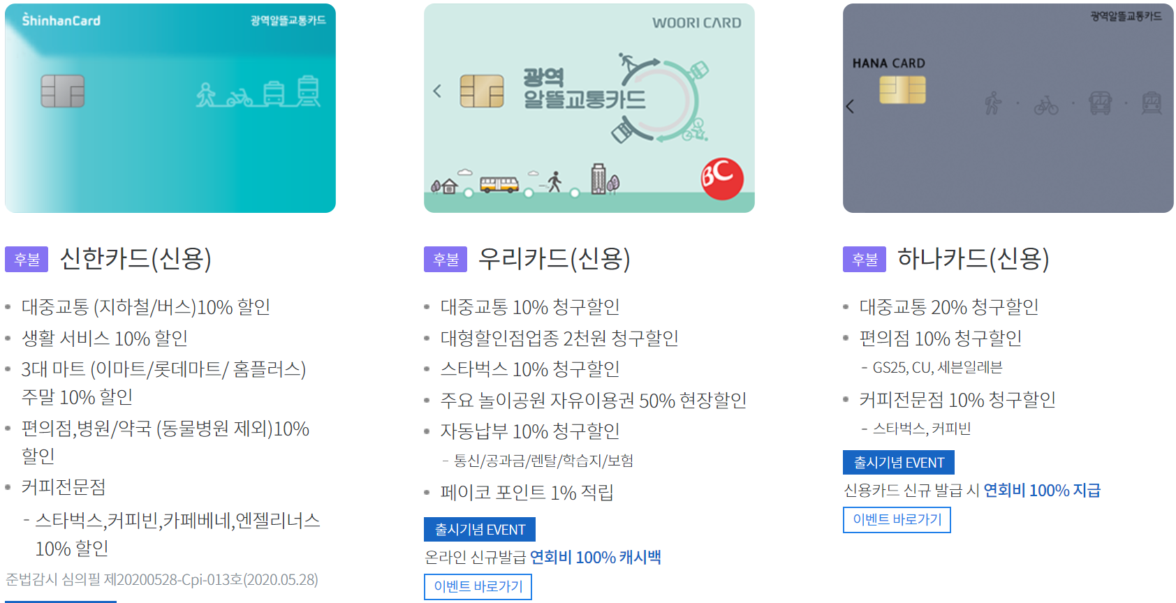 광역알뜰교통카드 혜택 현재 신한카드, 우리 카드, 하나카드에서 연계하여 사업서비스를 제공하고 있는데요.
