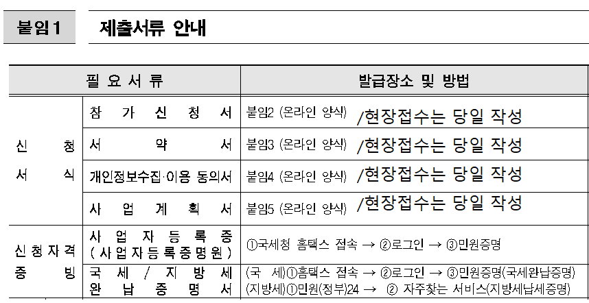 온라인 및 현장접수 모두 공통적으로 필요한 서류가 있습니다. 신청서 및 매출 감소 증빙자료, 종사자수 증빙 등 많은 부분에 있어서 서류가 필요하기에 꼭 사전에 꼼꼼하게 확인하여 준비를 잘 해야합니다.(서류양식 다운바로가기)