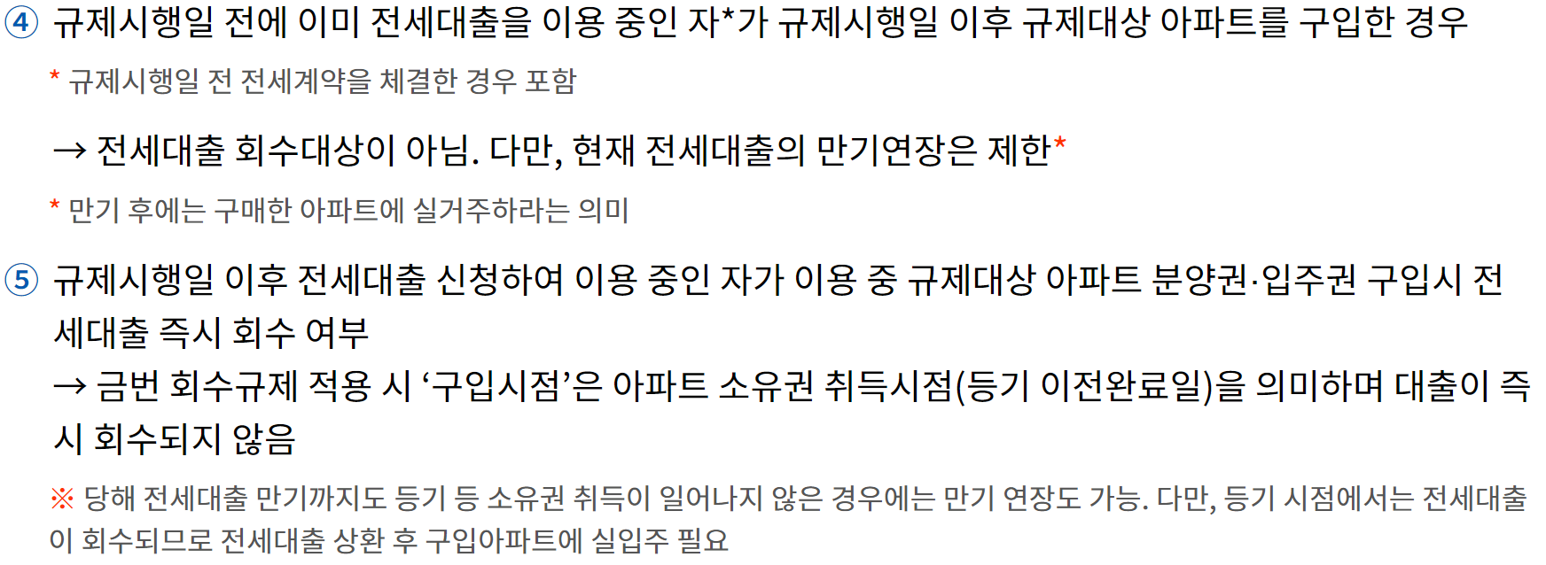 전세대출 회수 / 국토부 주택시장 안정을 위한 관리방안 둘째, 전세대출을 신청하여 이용 중인 사람이 규제대상 아파트를 구입할 경우 전세대출이 즉시 회수됩니다.
