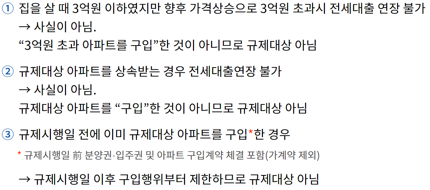 이번 발표로 인해 전세대출 규제의 적용 대상은 (1) 규제대상 아파트 구매행위 (2) 전세대출 신청행위 두 가지가 규제 시행일(2020.7.10) 이후 경우입니다.