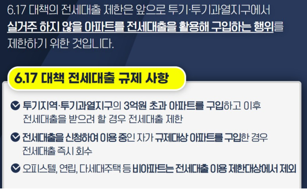 6.17 부동산 대책에서 전세대출 회수는 투기, 투기과열지구에서 실거주를 하지 않을 경우 아파트 전세대출을 활용해 구입하는 행위를 제한하기 위해 실행됩니다.