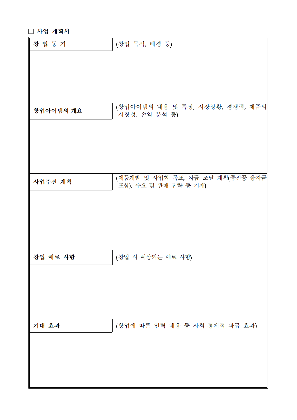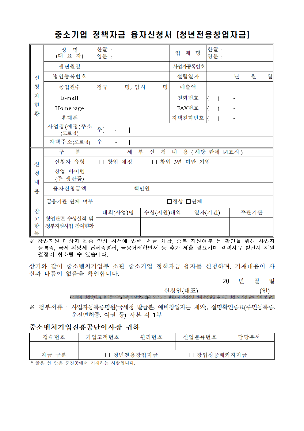 청년창업지원금 신청서 서식 2020년 청년전용창업자금 융자신청서.hwp0.03MB신청서 표지 및 기업현황 작성이 처음이라 어려울 수 있는데 작성요령까지 첨부하니 미리 확인하고 꼼꼼하게 작성하는데 도움이 되길 바랍니다.