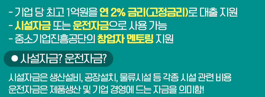 기업당 최고 1억 원을 연 2% 고정금리로 지원하게 되고 이뿐만 아니라 중소기업 진흥공단의 창업자 멘토링 서비스까지 받을 수 있습니다.