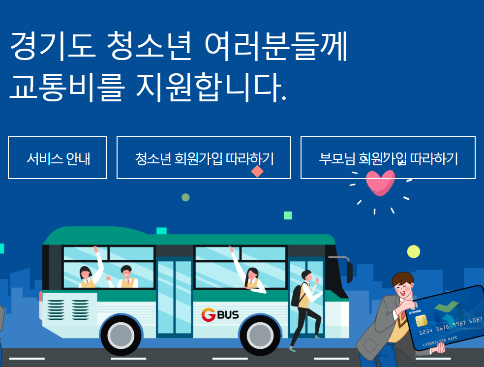 경기도 청소년 교통비 지원 신청방법은 경기도 청소년 교통비지원포털(신청바로가기)에서 온라인으로 신청해야 합니다.