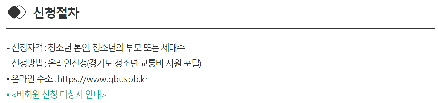 경기도 청소년 교통비 지원 신청방법은 경기도 청소년 교통비지원포털(신청바로가기)에서 온라인으로 신청해야 합니다.