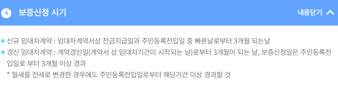 다른 곳에서 실시하는 전세보증보다 시기는 조금 빠른 편이니 임대차 계약 이후 바로 실시하는 것이 좋습니다.
