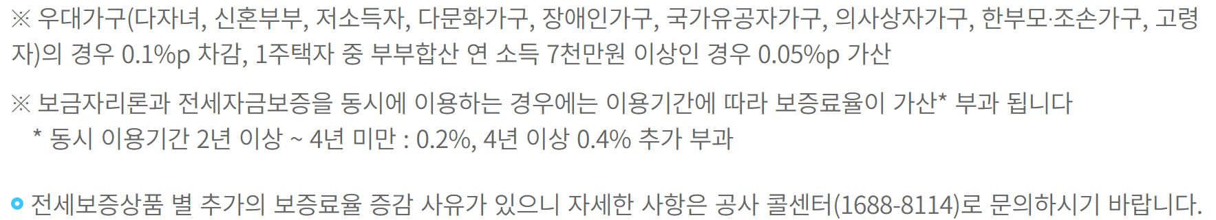 우대가구 전세보증률 할인 / 한국주택금융공사 최소 0.05%라고 했는데 이것은 보통 2억 이하 빌라 등에 거주할 경우, 우대 가구의 경우 0.1%가 차감됩니다.