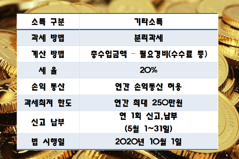 개정안에 따르면, 2021년 10월부터 거주자가 가상자산(가상화폐 등)을 양도하면 기타소득으로 과세가 됩니다.
