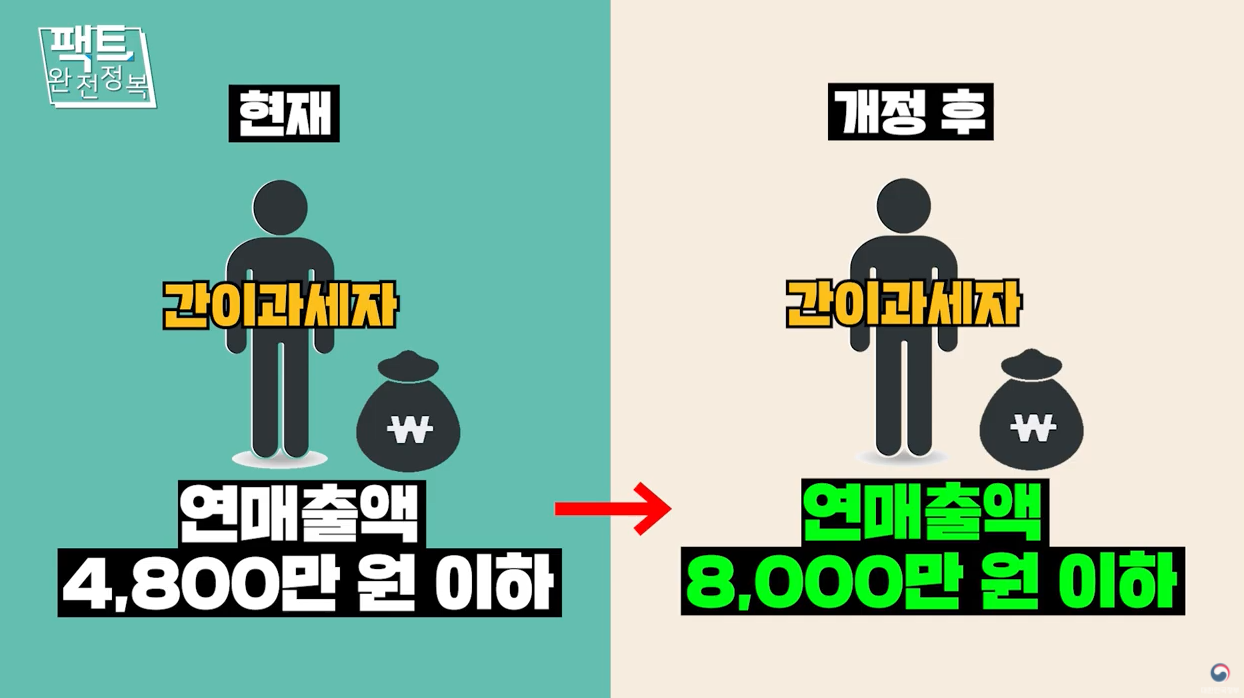 앞서 서민에 대해서는 세금부과 기준이 낮아졌다고 했는데 대표적인 예로 부가가치세 납부면제 기준과 간이과세 기준이 완화되었습니다.