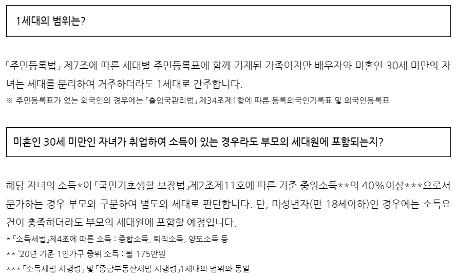 우선 정부에서는 다주택자 판단 기준인 1세대의 범위를 규정하였습니다.