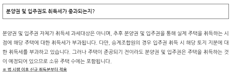 분양권 및 입주권 자체가 취득세 과세 대상은 아니지만, 추후 분양권 및 입주권을 통해 실제 주택을 취득하는 시점에 해당 주택에 대한 취득세가 부과됩니다.