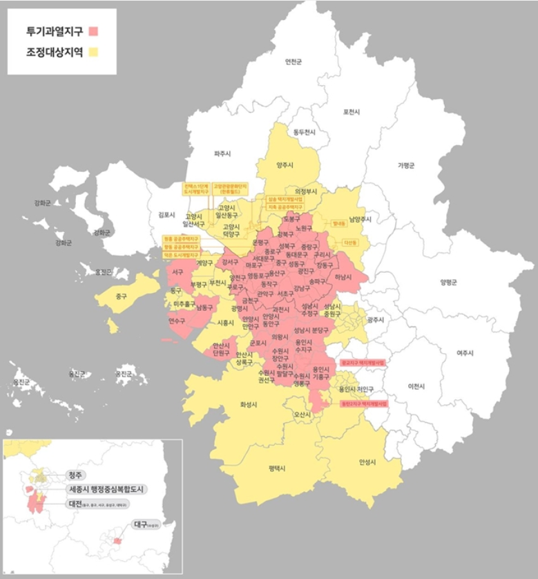 ⓒ국토부 수도권 거의 모든 전역이 조정대상 지역 및 투기과열지구입니다. 여기에 더불어 이번에 새롭게 지방 대전, 청주, 세종, 대구광역시가 포함되어 있습니다.