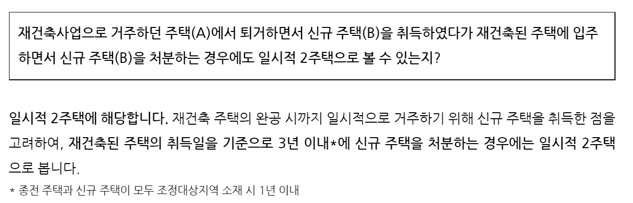 A. 일시적 2 주택에 해당합니다. 재건축 주택의 완공까지 일시적으로 거주하기 위한 것으로 판단되며, 재건축 주택의 취득일을 기준으로 비규제 지역 3년, 규제지역 1년 이내로 임시로 거주하던 신규주택을 처분하면 됩니다.