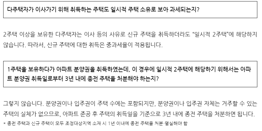 1 주택을 소유한 세대가 거주지를 이전하기 위하여 신규 주택을 취득하여 일시적으로 2 주택이 된 경우 신규 주택 취득은 중과세를 적용하지 않습니다.
