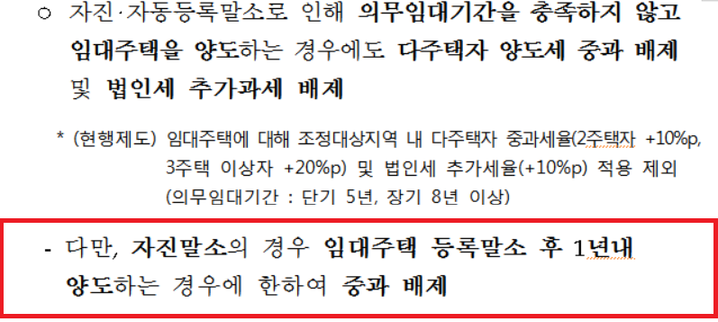 민간임대주택법 개정으로 임대의무기간이 경과하기 전에 세입자의 동의가 있으면 임대 등록을 말소할 수 있습니다. 이런 경우에도 임대의무기간 1/2 이상이 경과하고 자진 말소한 날부터 1년 이내 해당 주택을 매도하는 경우 양도소득세 중과되지 않습니다.