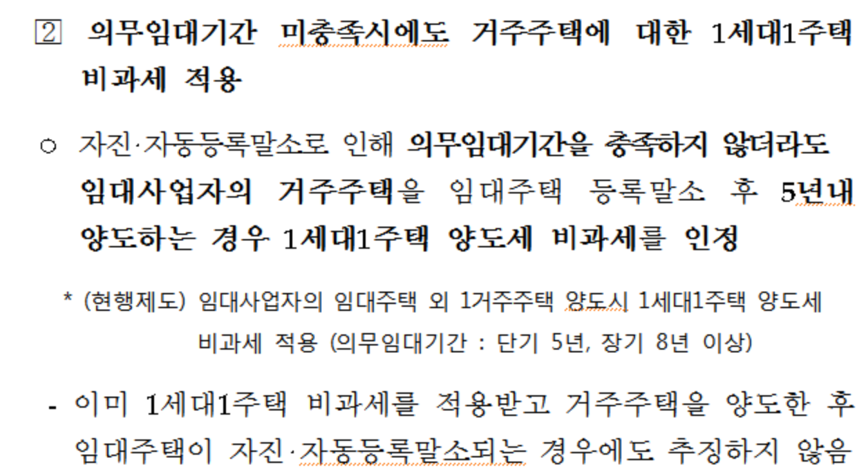 ⓒ정부 하지만 민간임대주택 개정으로 4년 임대의무기간이 경과되는 경우 직권으로 말소가 되어 5년 의무임대 기간을 충족하지 못하는 경우라도 5년 이내 매도 시 양도소득세 비과세를 인정합니다.