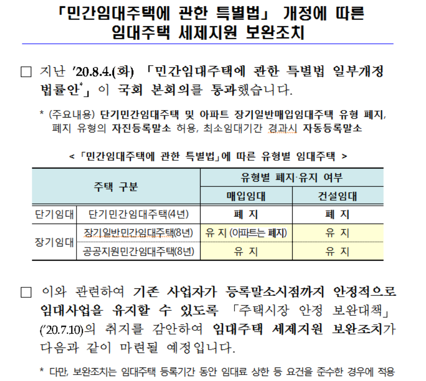 2020년 7월11일을 기준으로 민간임대주택법이 개정이 되어 매입, 건설 단기 민간임대주택(4년) 및 매입 장기일반 민간임대주택(8년, 아파트) 등록이 폐지가 되었습니다.