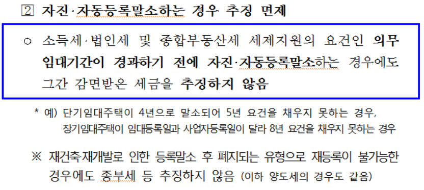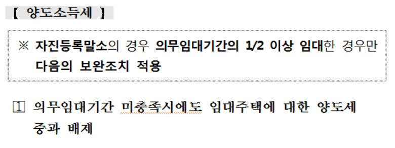 아닙니다. 세법상 임대기간과 민감임대주택법에 사이에 임대기간이 차이가 발생하여 혜택을 못 받는 경우에도 이번 보완책으로 임대 등록일부터 자진 또는 직권 등록말소일 까지 세제 혜택이 유지됩니다.