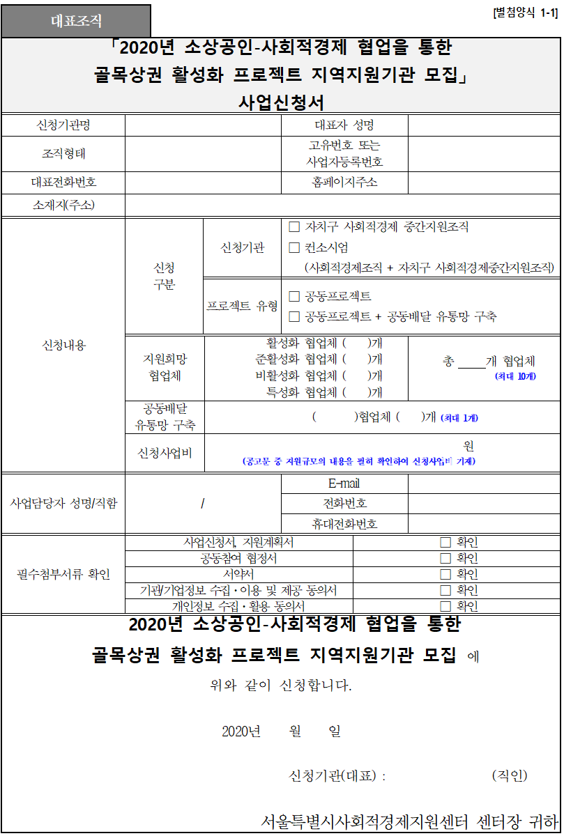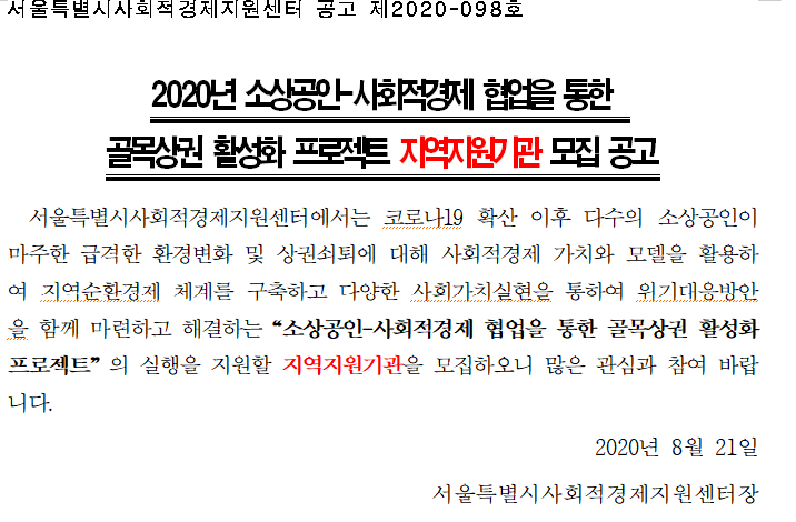 ⓒ서울시 2020년-소상공인-사회적경제-협업을-통한-골목상권-활성화-프로젝트-지역지원기관-모집-공고.hwp0.20MB세부사항 및 신청양식은 첨부해드리오니 꼭 자세히 확인해볼 필요가 있습니다.