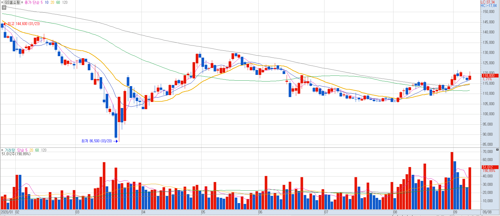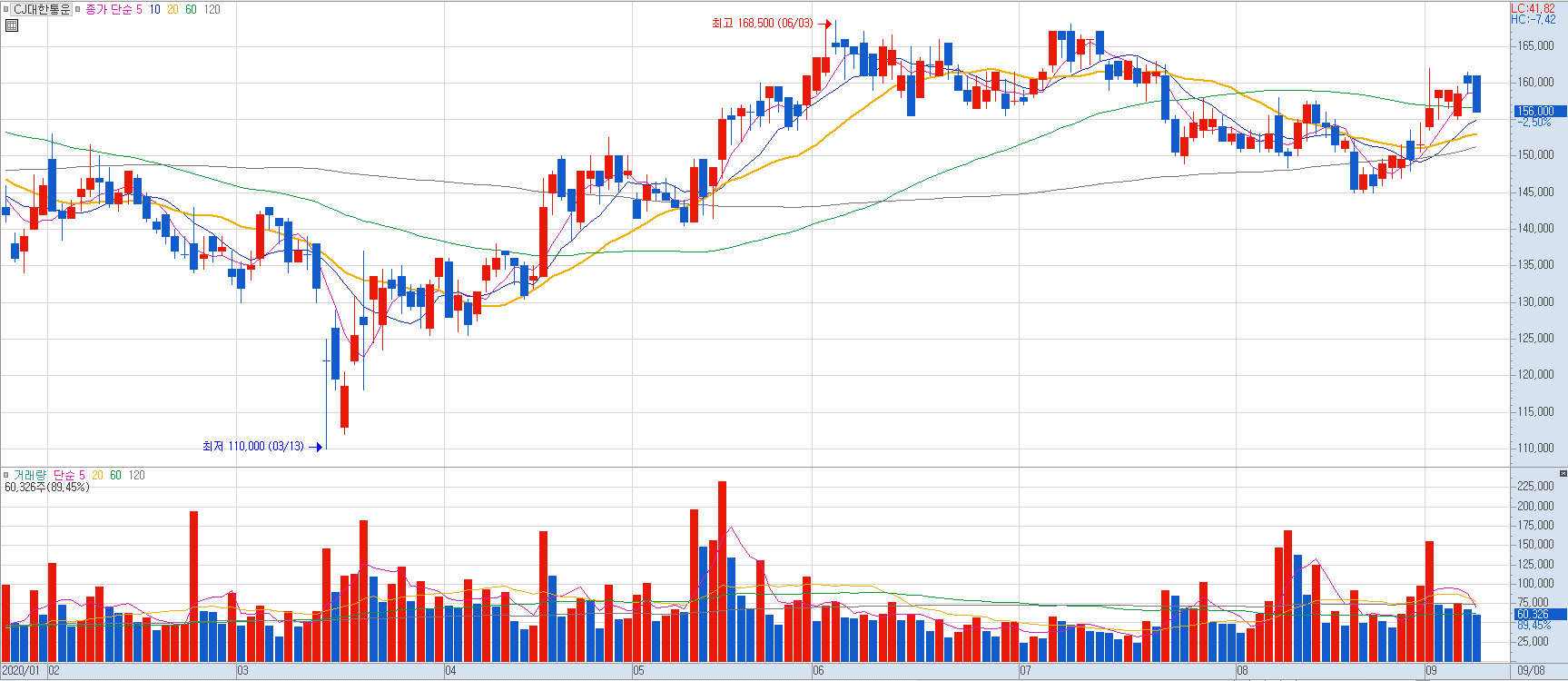 코로나 19로 인한 택배물량이 급증하면서 지속적으로 주가가 전고점을 거의 회복하고 우상향 하는 것을 볼 수 있네요.