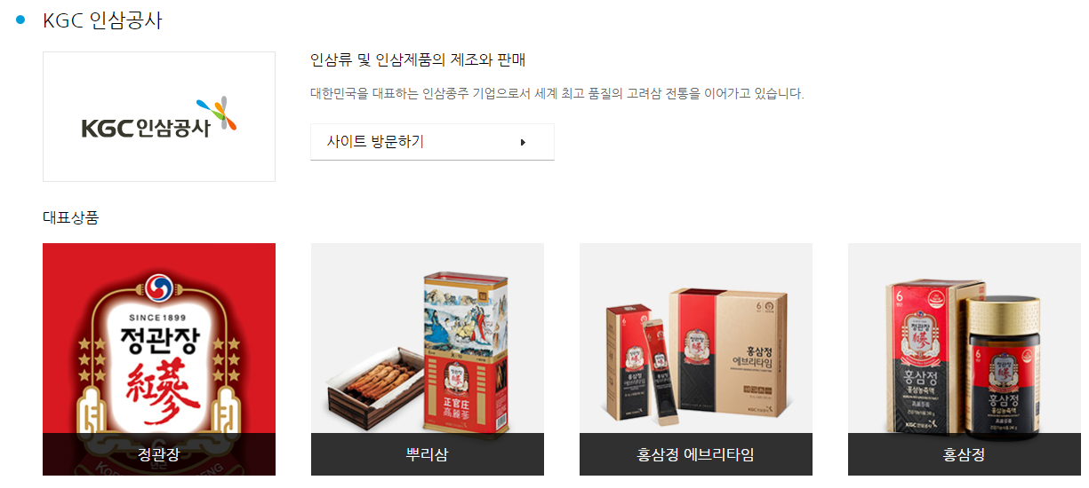누구나 익히 들어 봤을 기업으로 대중적인 이미지를 가지고 있으며 자회사 정관장은 추석 선물로 인기가 높은 홍삼, 인삼을 판매하고 있습니다.