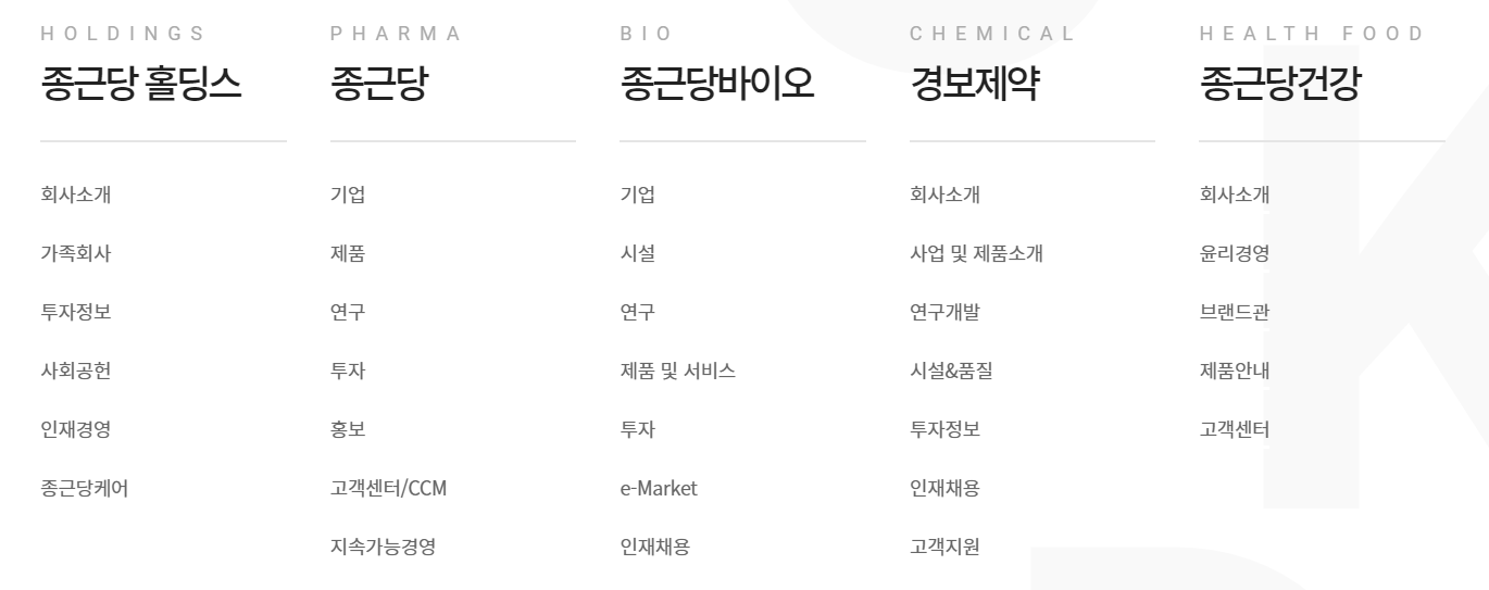 종근당, 바이오, 건강을 자회사로 두고 있으며 사업부문은 지주사업, 원료의약품 사업, 건강기능식품사업, 완제의약품 사업을 영위하고 있습니다.