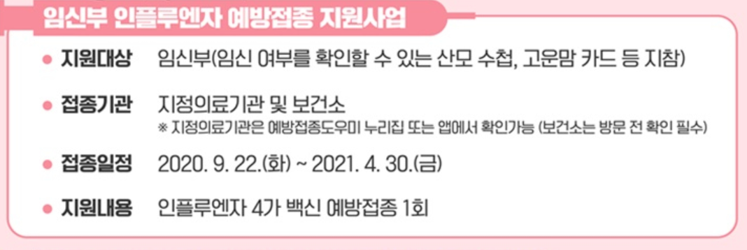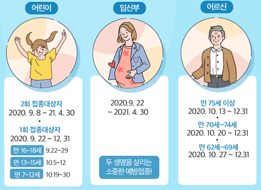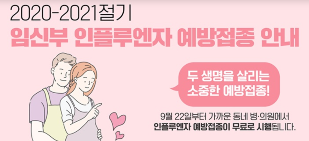 임신부는 2019년과 동일하며 9월 22일부터 병·의원에서 인플루엔자 예방접종이 무료로 시행됩니다.