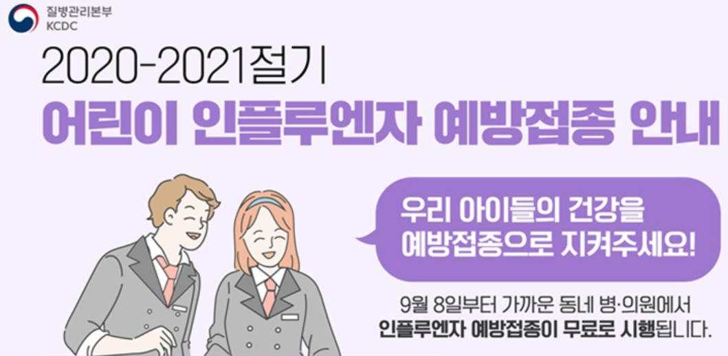 ⓒ정부 먼저, 어린이 인플루엔자 예방접종은 9월 8일부터 가까운 동네 병·의원에서 인플루엔자 예방접종이 무료로 시행됩니다.
