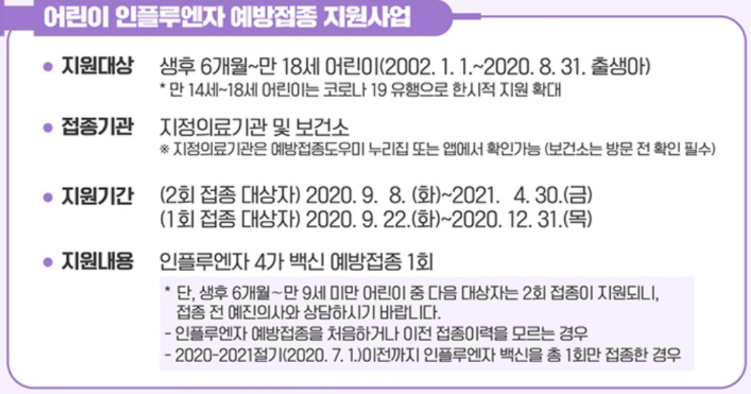 단, 생후 6개월~만 9세 미만 어린이 중 다음 대상자는 2회 접종이 지원되니, 접종 전 예진 의사와 상담하는 게 좋습니다.