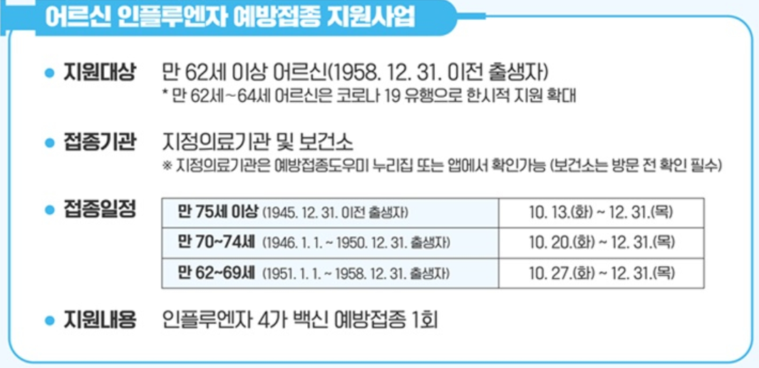 ▶어르신 인플루엔자 무료 예방접종 일정①만 75세 이상 (1945. 12.31. 이전 출생자) 10. 13.(화) ~ 12. 31.(목)