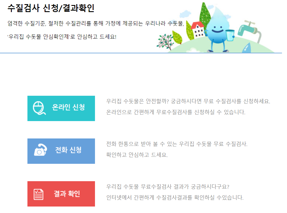 게다가 수질검사 결과는 전화, 문자, 홈페이지를 통해 간편하게 확인 가능합니다.