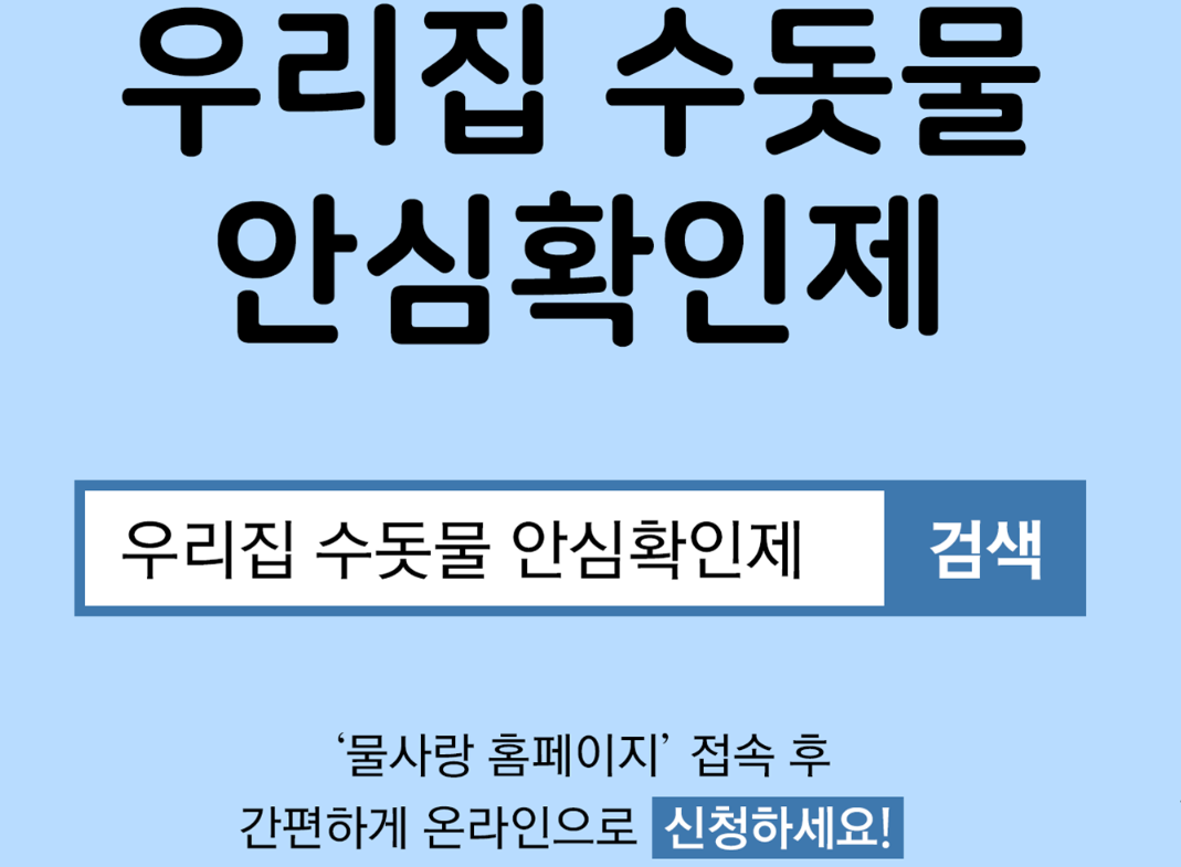 우리집 수돗물 안심확인제를 통한 무료 수질 검사기관 방문 신청은 물사랑 홈페이지(바로가기)에서 가능합니다.