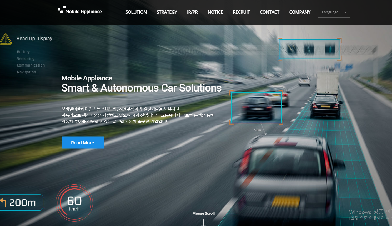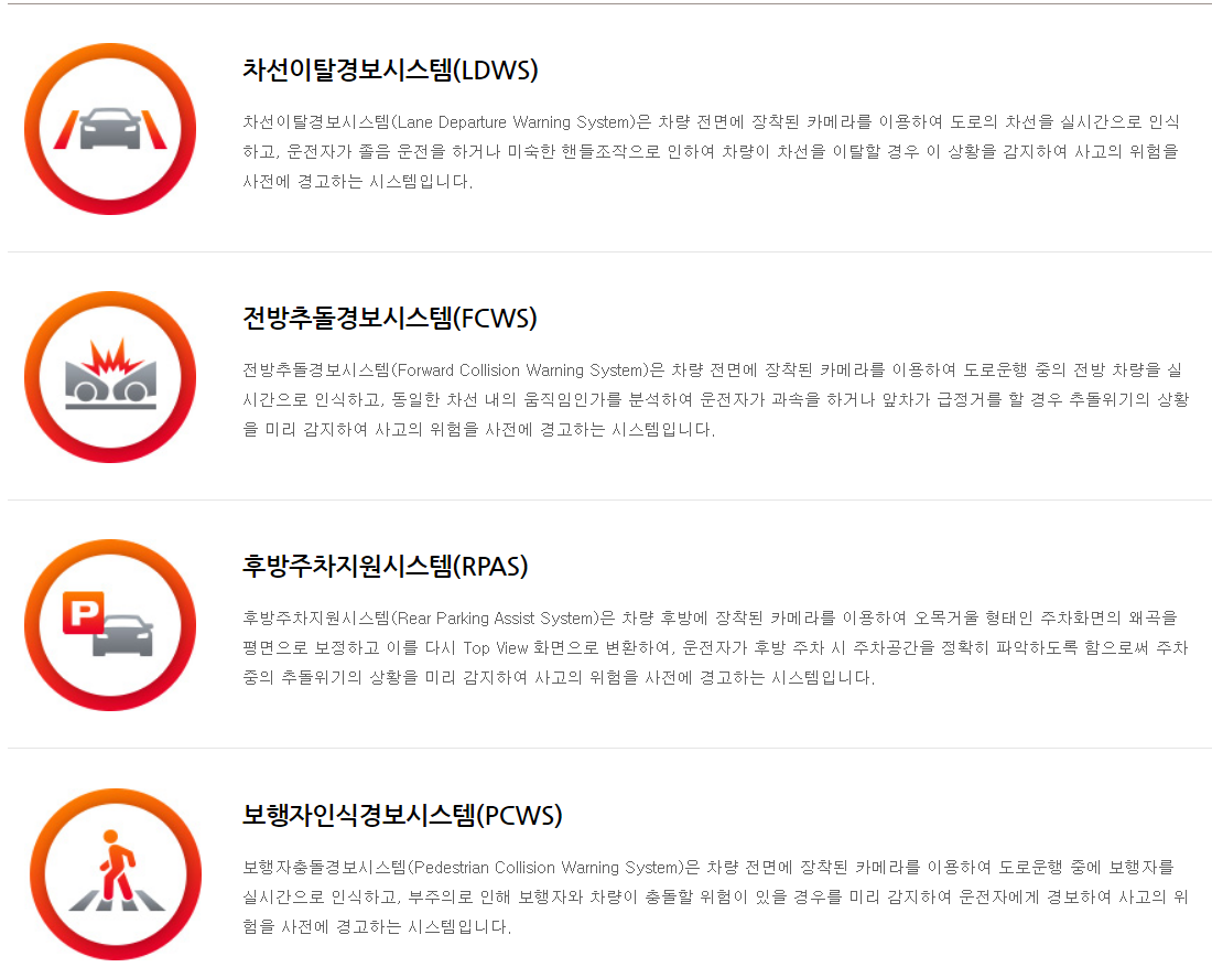 더불어 자율주행에 필요한 다양한 ADAS사업과 관련한 차선이탈 경보시스템, 전방 추돌 경보시스템, 후방 주차지원시스템, 보행자 인식경보시스템 등의 기술력을 보유 발전시키고 있습니다.