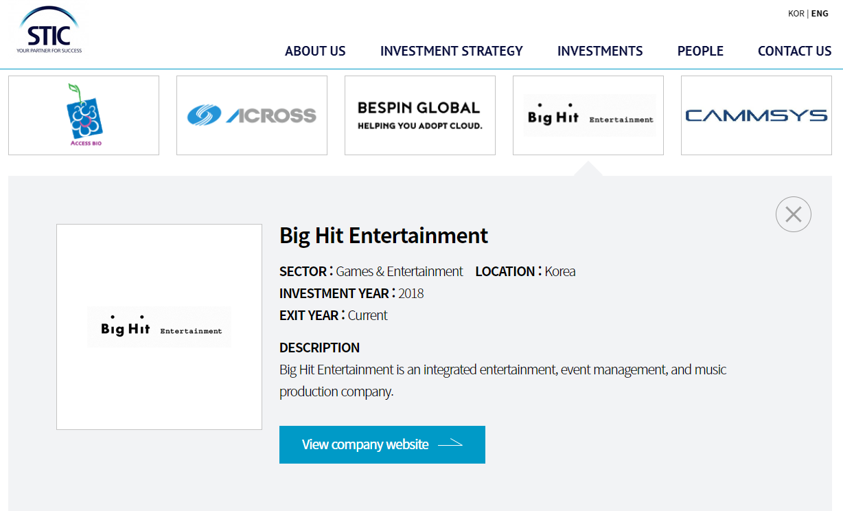 투자부문에서는 프라이빗에쿼티 펀드 및 벤처투자조합 운영, 부동산 및 인프라에 대한 사모펀드 운영 등을 운영하는데 여기서 자회사인 스탁인베스트먼트에서 빅히트엔터 지분 12.15%보유하고 있습니다.