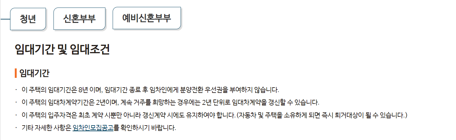 주의할 점은 입주자격은 최초 계약 시뿐만 아니라 갱신계약 시에도 유지하여야 합니다.