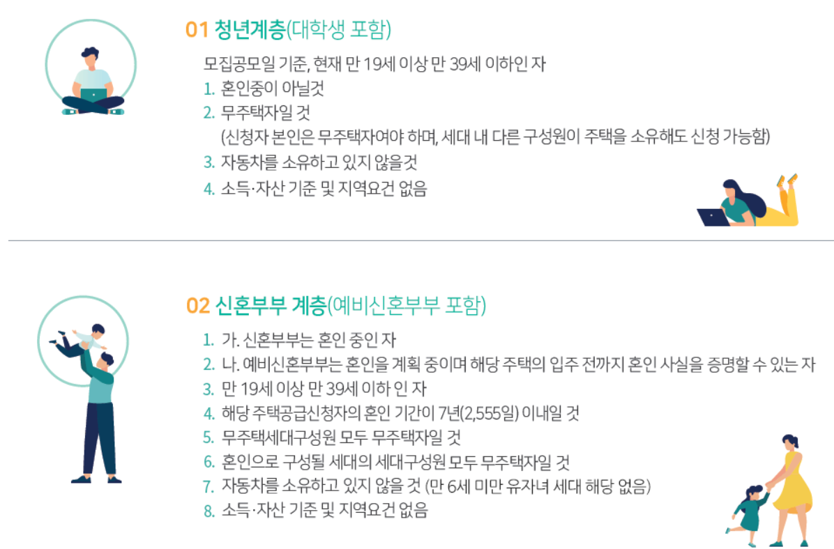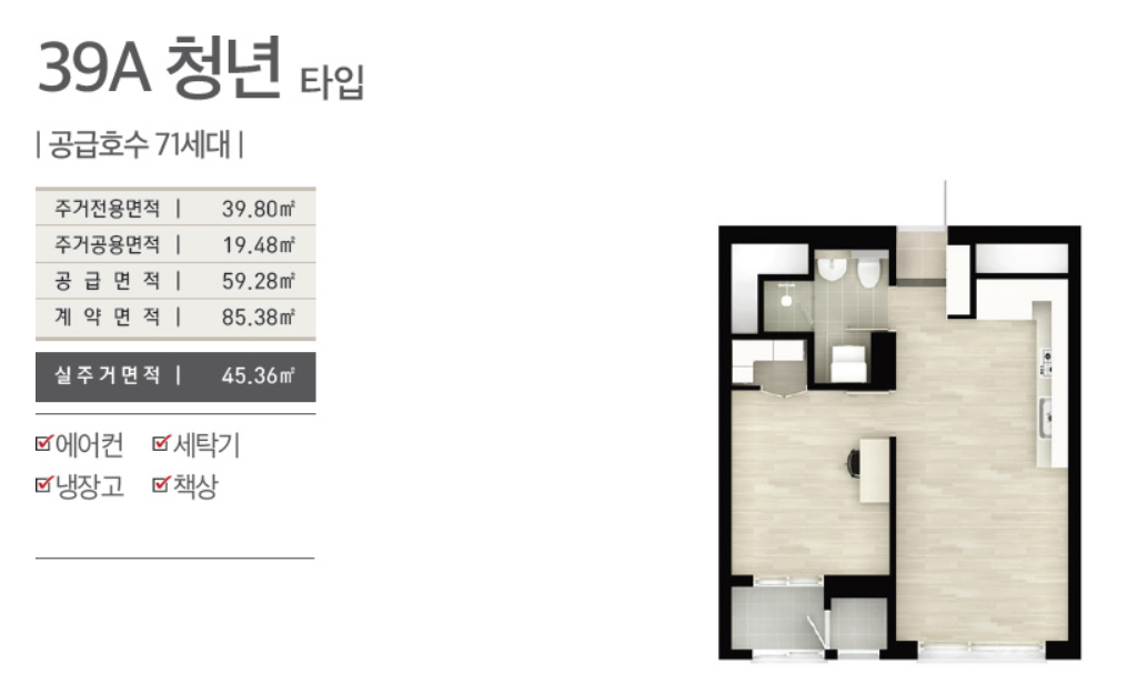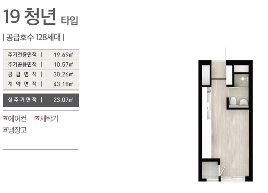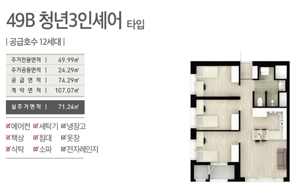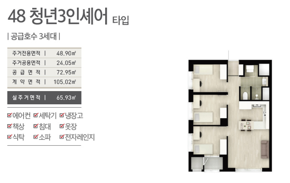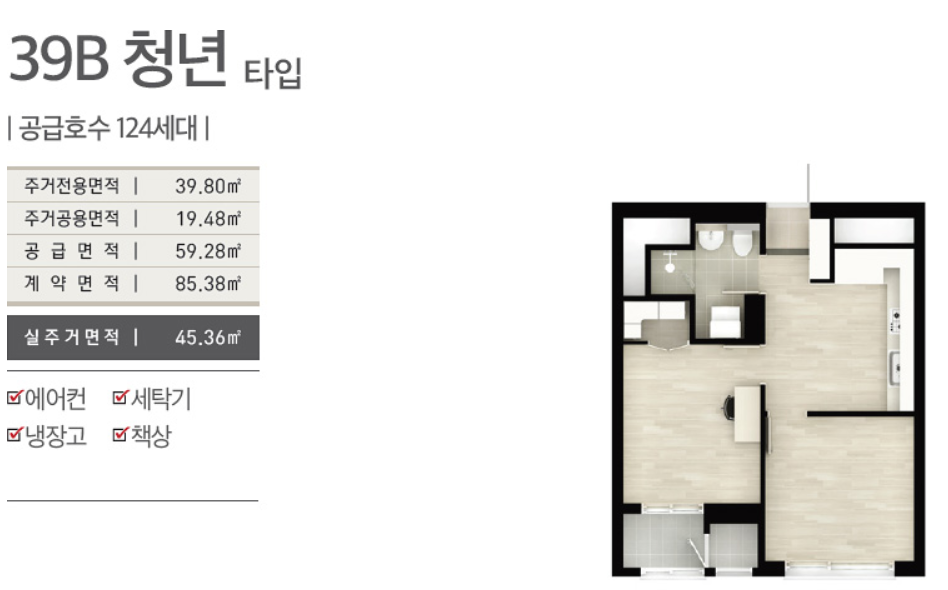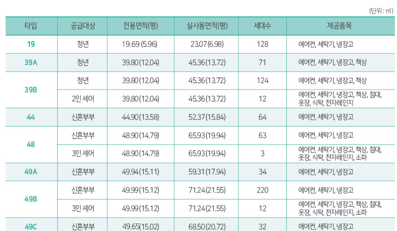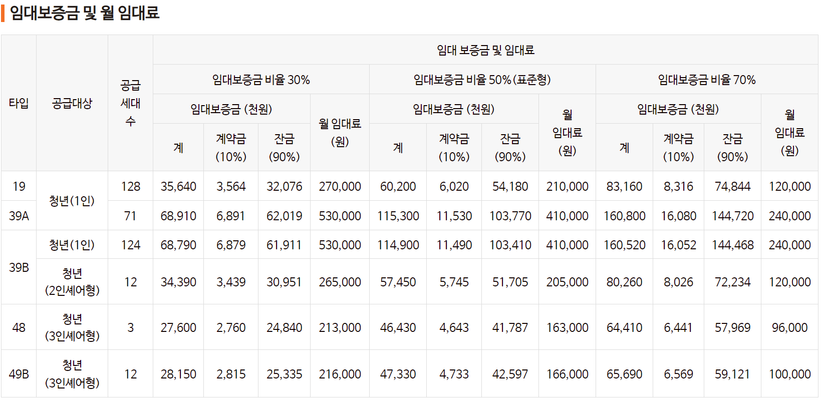 청년의 경우 1 인형(19~39B) , 2인 셰어형(39B), 3인 셰어형(48,49B)에 따라 임대료가 다릅니다.