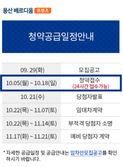 용산 베르디움 프렌즈 청약 공급일정은 24시간 접수가 가능하며, 21일 당첨자 발표가 이루어지고 다음날부터 임대차 계약이 시작되는데요.