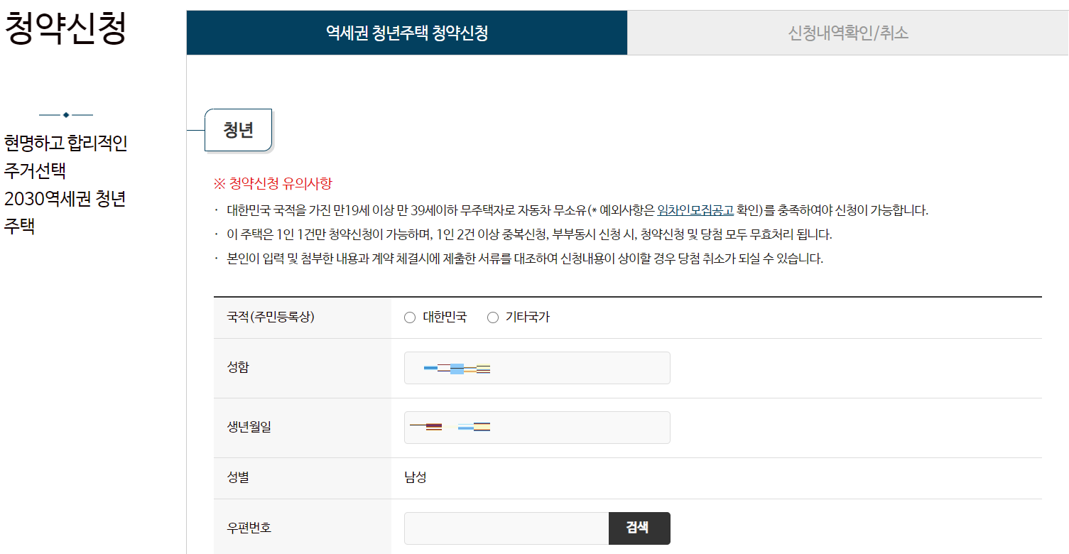 청약 시 유의사항은 1인 1건만 청약신청이 가능하며, 1인 2건 이상 중복신청 또는 부부 동시 신청 시, 청약신청 및 당첨 모두 무효처리되니 조심해야 합니다.