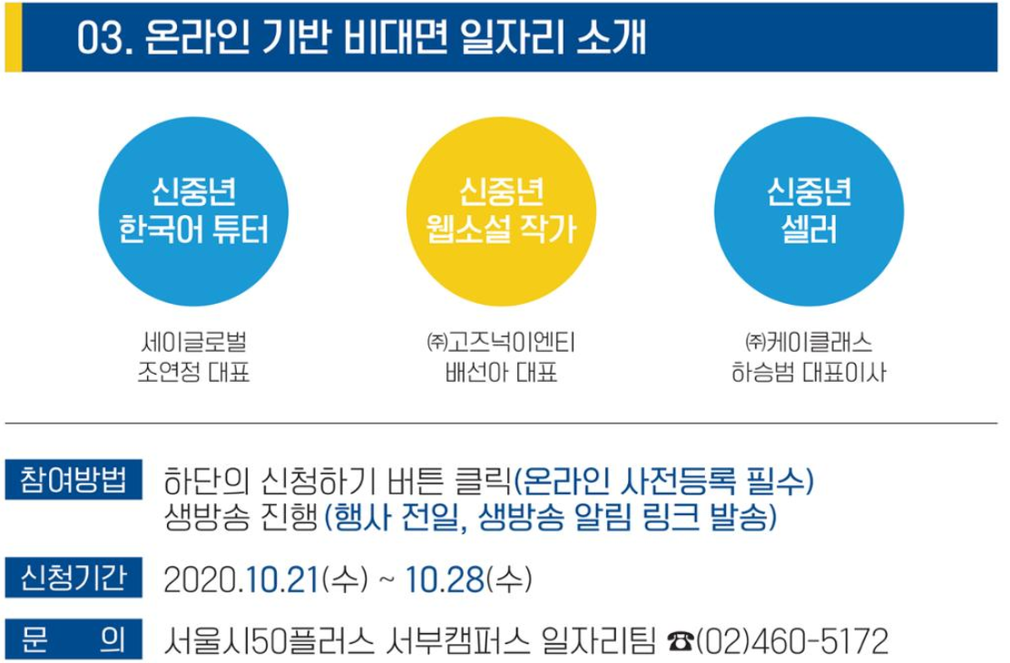 안녕하세요. 서울시에서 비대면 시대에 취업을 준비하는 50+세대를 위한 ‘취업트렌드 세미나’를 개최합니다.